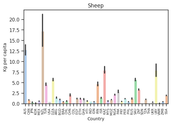 This plot gives a great overview of the the amount of meat each country is consuming. I decided to plot the KG per capita measure since it will give us a better picture of the proportion of consumption. This was we can compare big and small countries better.