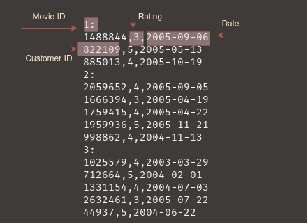 The training set is the most important in which contains all the ratings. It is formatted as a directory of 17,770 movies with each directory containing all the ratings for the movie. Luckily, the data has already been converted to a text file that is grouped by movie but still needs to be reformatted to follow convention for Pandas data frames.