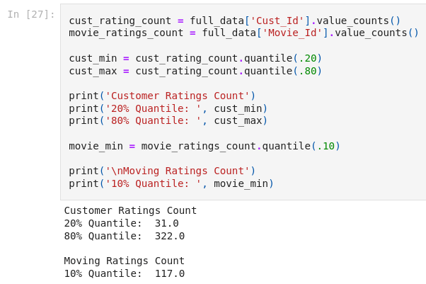 To further reduce the size, I removed outliers. Somehow, some users apparently rated nearly 17,000 movies which is almost the entire catalog. Not sure how that would be possible but I think it would throw off the model as that is not representative of normal user. I removed customers that had too many ratings and ones that had too little ratings. I decided to trim the top 20% and the bottom 20% of customers (in terms of rating count). A did a similar action for movies but only removed the bottom 10% in ratings received. I figured more ratings is a good thing for movies.