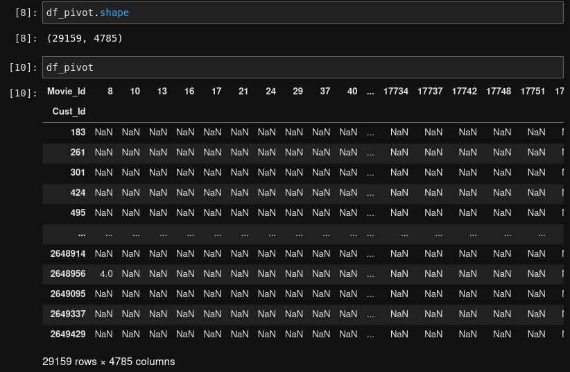 At this point, the data is formatted into three columns: Customer_Id, Rating, Movie_Id. The issue with this format is that the ID’s for both customers and movies are repeated throughout the data. I think it would better to reformat is with customer ID as the index and a column for each movie. Each cell will contain a rating if applicable, null otherwise. This process is similar to One-Hot Encoding.